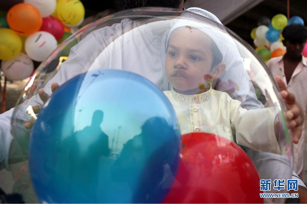 5月13日,在巴基斯坦南部城市卡拉奇,一名兒童在開齋節(jié)慶祝活動上玩氣球。新華社發(fā)