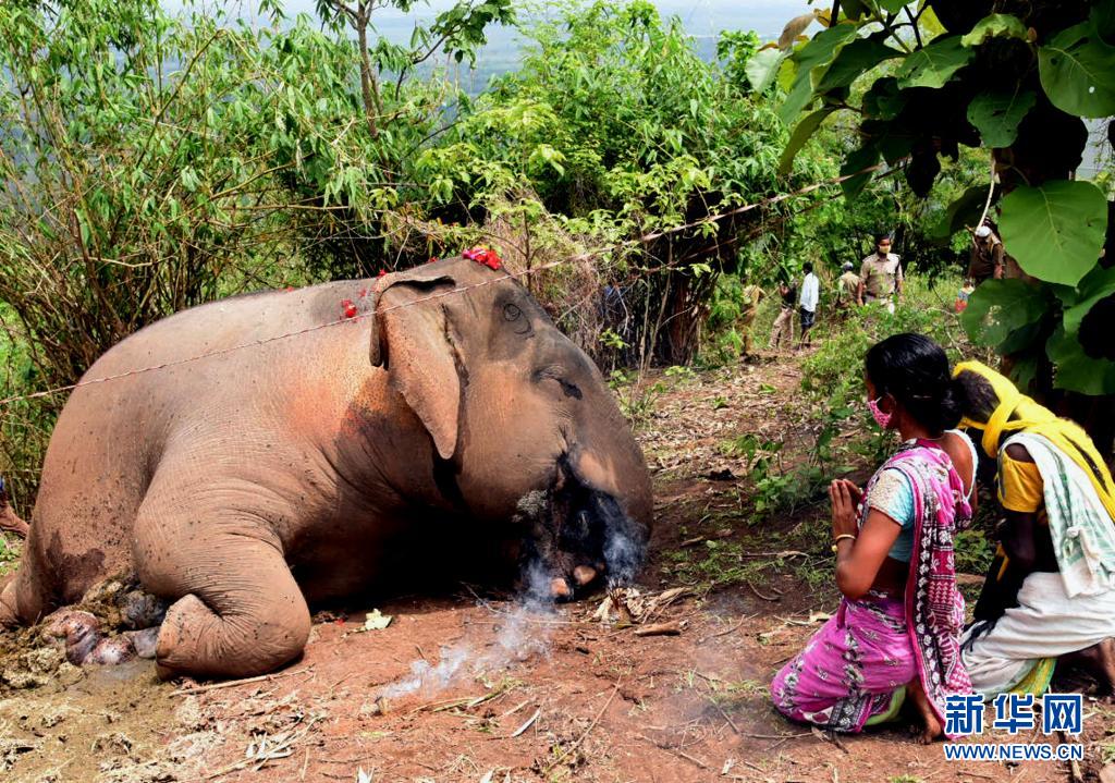 5月14日,人們在印度阿薩姆邦納加奧恩地區一頭死去的象旁禱告。