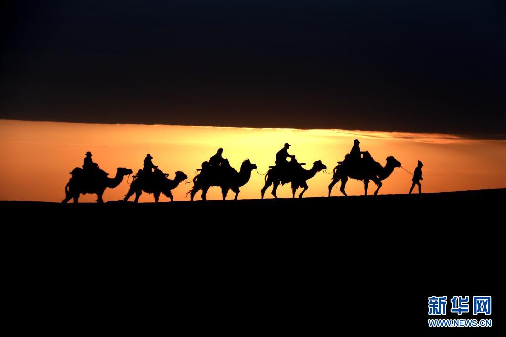 5月15日,游客騎駱駝在甘肅省敦煌市鳴沙山月牙泉景區游覽。晨光下,云彩、沙山、駝隊構成了一幅美麗迷人的畫卷。新華社發(張曉亮 攝)