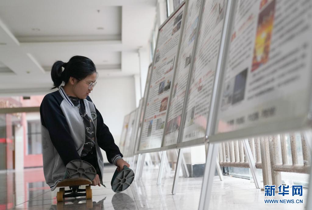 2021年5月11日,蔣張子怡在學(xué)校的走廊內(nèi)閱覽海報。