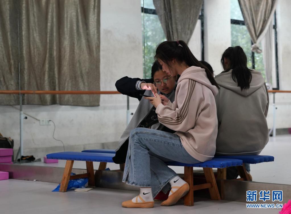 2021年5月11日,蔣張子怡(左)在學(xué)校的舞蹈房?jī)?nèi)和同學(xué)交流舞蹈動(dòng)作。