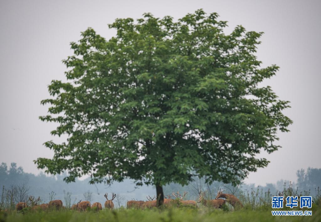 5月17日,一群麋鹿在石首麋鹿國家級自然保護區內活動。新華社記者 肖藝九 攝