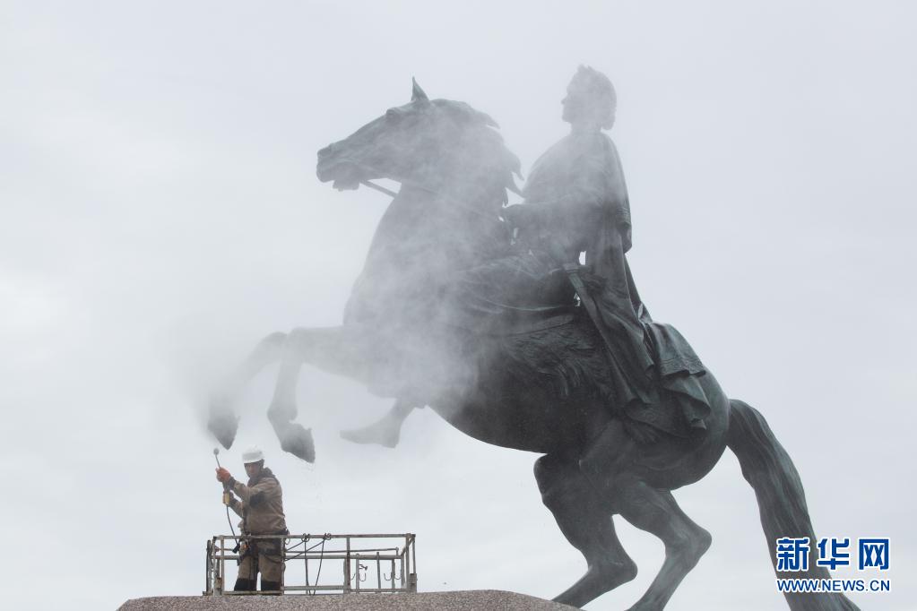 5月26日,工作人員在俄羅斯圣彼得堡清潔“青銅騎士”雕像。
