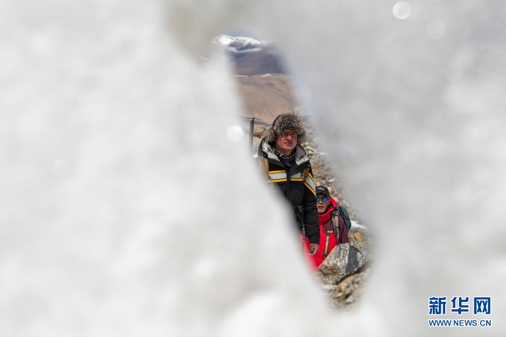 別克米爾扎·圖爾達力(前)和同伴庫爾班巴依·努爾麥麥提在適應性練習中從冰川旁經過(5月16日攝)。新華社記者 胡虎虎 攝
