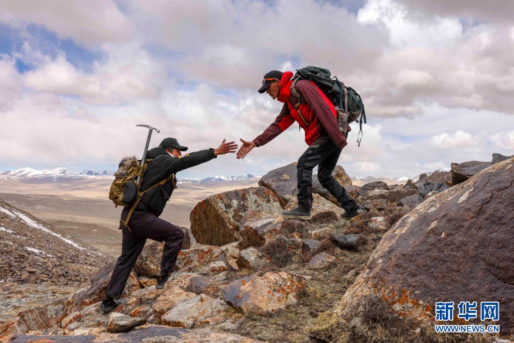 別克米爾扎·圖爾達力(左)在同伴庫爾班巴依·努爾麥麥提的幫助下跨過一段亂石密布的山路(5月16日攝)。新華社記者 胡虎虎 攝