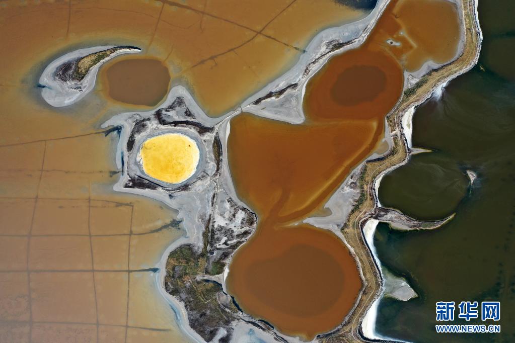 近日,隨著氣溫不斷升高,山西運城鹽湖呈現五彩斑斕的景象。
