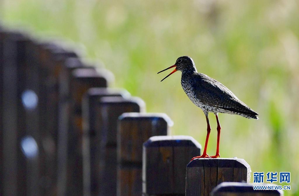 初夏,紅腳鷸在位于西藏拉薩的拉魯濕地國家級自然保護區內起舞覓食。