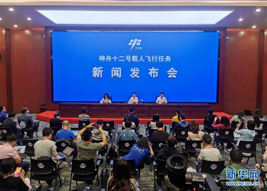 6月16日,神舟十二號載人飛行任務新聞發布會在酒泉衛星發射中心召開(手機拍攝)。