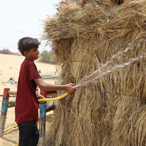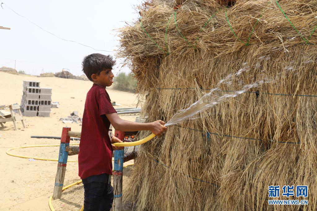 6月17日,一名男孩在也門北部哈杰省的一座難民營內(nèi)給自家的茅草屋澆水降溫。