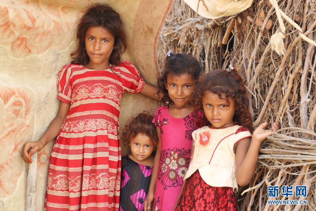 6月17日,孩子們站在也門北部哈杰省一座難民營(yíng)內(nèi)。