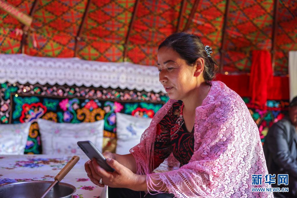 在新疆裕民縣巴爾魯克山區夏牧場上,一名開辦牧家樂的牧民在氈房內用手機上網(6月16日攝)。