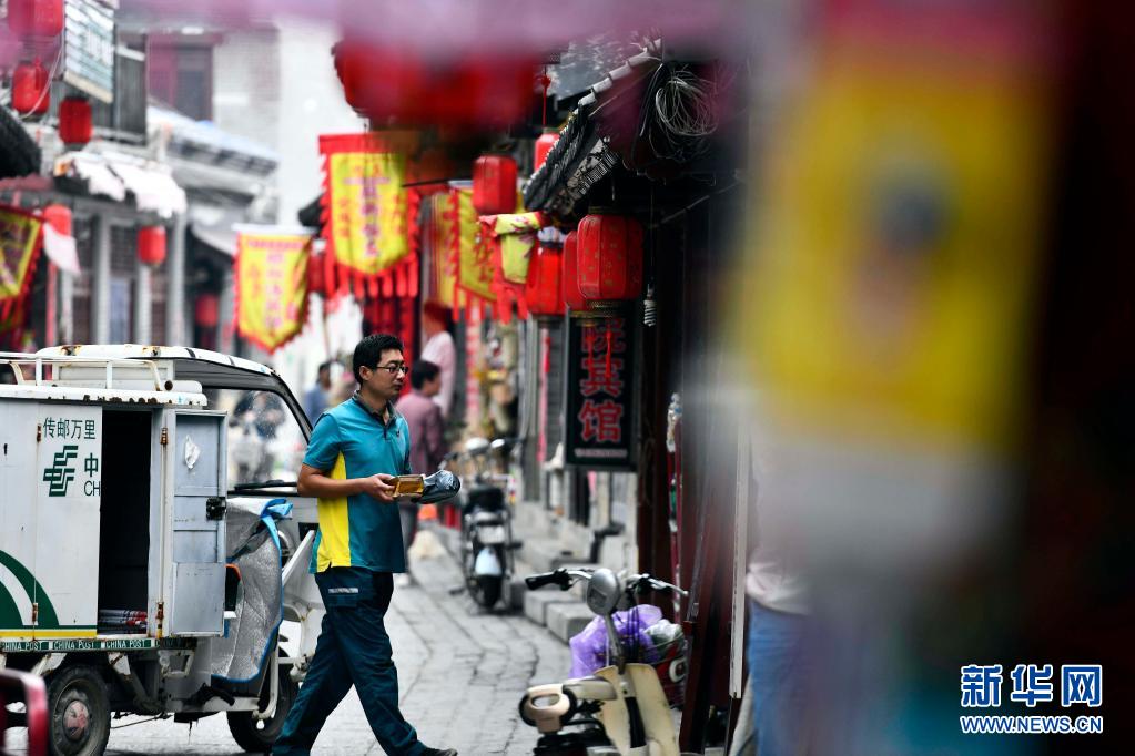 6月20日,在微山縣南陽鎮,郵遞員王少朋在投遞郵件。