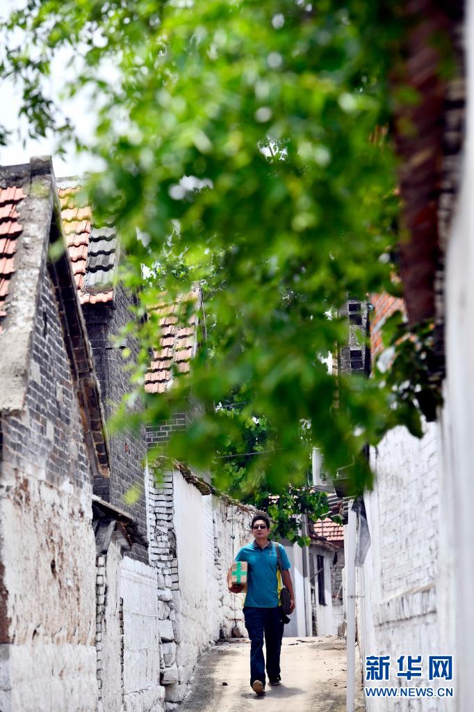 6月20日,在微山縣南陽鎮,郵遞員王少朋為柳溝村村民投遞郵件。
