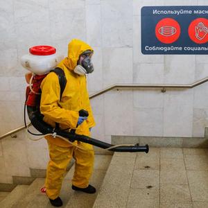 6月24日,工作人員身著防護服在俄羅斯莫斯科一個火車站進行消毒作業。