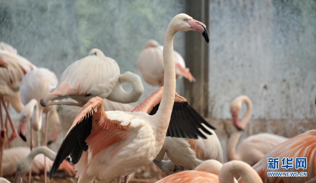 北京動物園內的火烈鳥在室內乘涼(6月28日攝)。