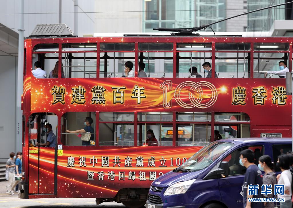 6月29日在香港街頭拍攝的叮叮車上的慶祝標語。