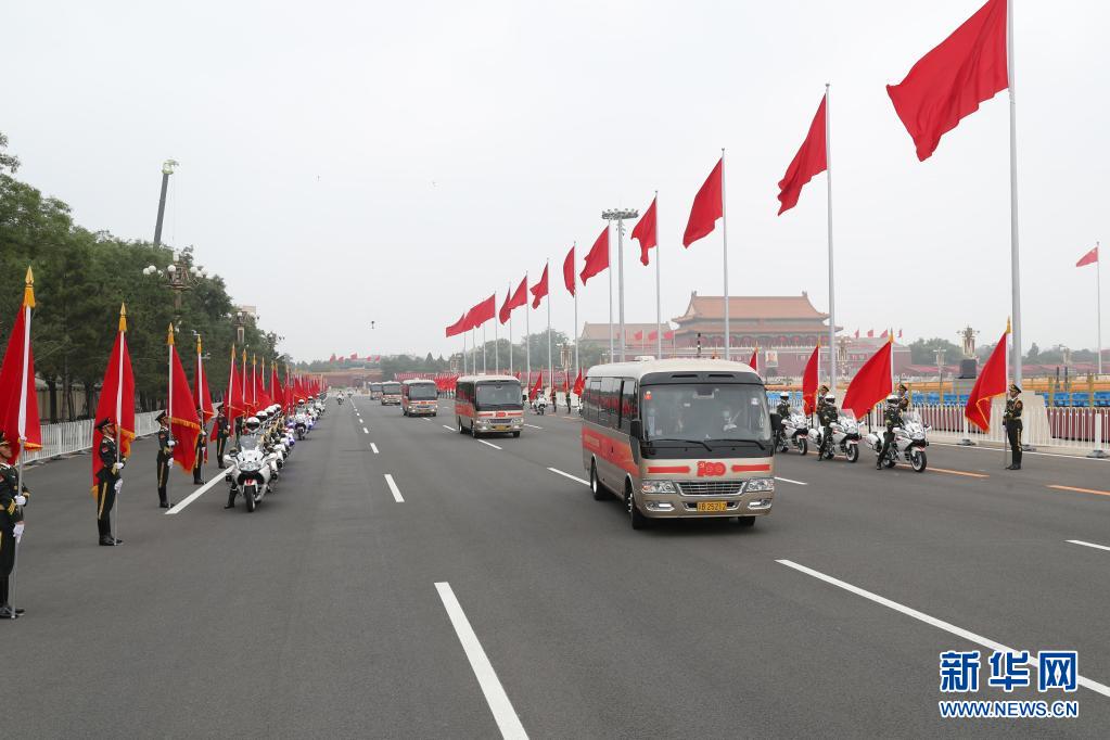 6月29日,慶祝中國共產黨成立100周年“七一勛章”頒授儀式在北京人民大會堂金色大廳隆重舉行。這是“七一勛章”獲得者集體乘坐禮賓車,由國賓護衛隊護衛前往人民大會堂。新華社記者 丁海濤 攝