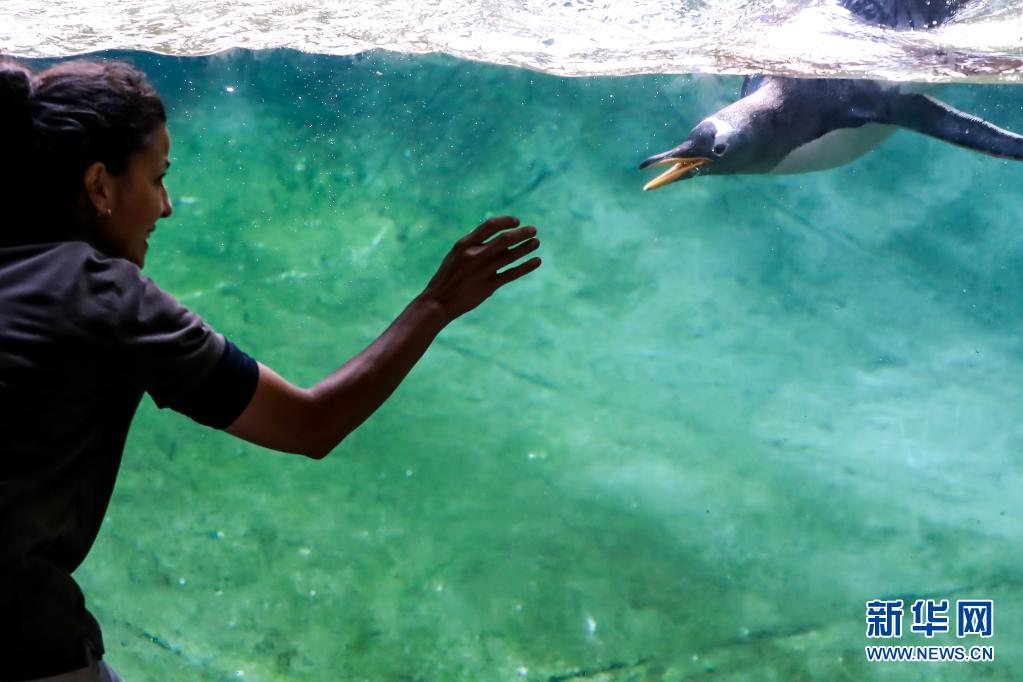 7月5日,飼養(yǎng)員在比利時(shí)布呂熱萊特的天堂動(dòng)物園與巴布亞企鵝互動(dòng)。