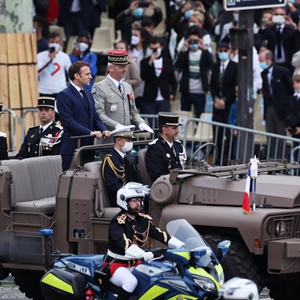 7月14日,法國總統馬克龍在巴黎協和廣場國慶閱兵式現場檢閱隊伍。