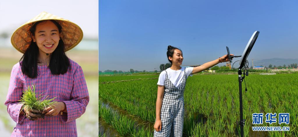 拼版照片:左圖為程玉嬌在太原市晉源區三家村水稻田里;右圖為程玉嬌在水稻田里進行直播(7月9日攝)。今年24歲的程玉嬌2019年留學回國后,選擇了返鄉創業發展稻魚菜綜合種養農業。晉源區三家村出產的大米遠近聞名,程玉嬌在社交平臺上開通了雙語直播,在科普水稻知識的同時拓展銷售渠道,不僅生意做得風風火火,自己也變成了小有名氣的“網紅”。