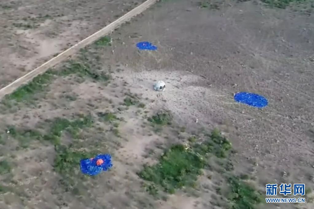 這張美國(guó)藍(lán)色起源公司7月20日發(fā)布的視頻截圖顯示“新謝潑德”飛行器在美國(guó)得克薩斯州西部著陸。