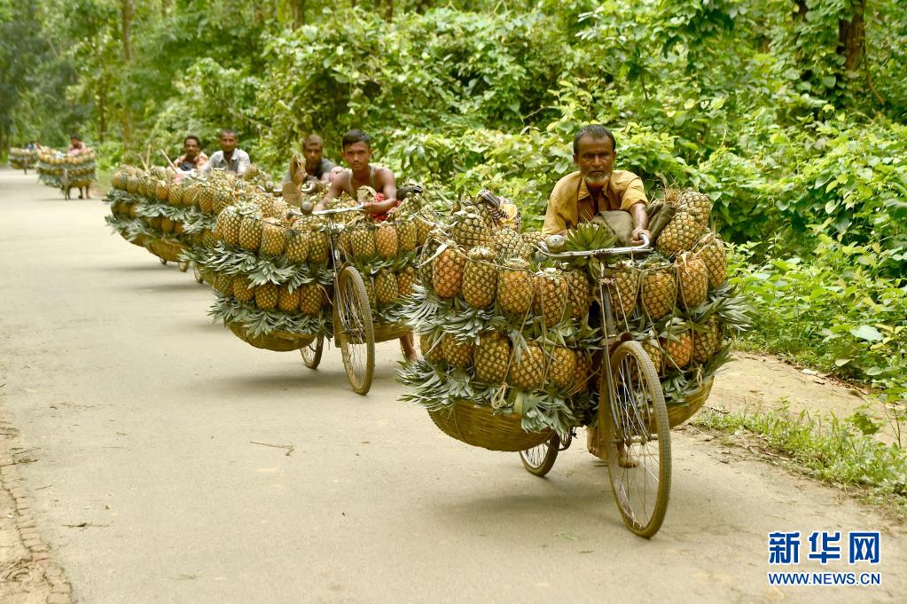 7月25日,農(nóng)民在孟加拉國坦蓋爾運(yùn)輸收獲的菠蘿。