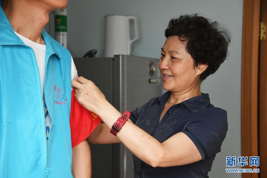 8月14日,在北京市海淀區(qū)薊門(mén)里社區(qū),董星梅在家中為準(zhǔn)備去社區(qū)出入口值守的丈夫馮向東整理著裝。