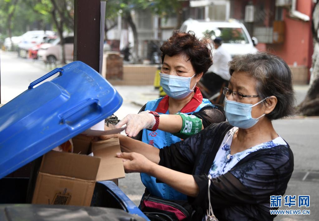 在北京市海淀區薊門里社區,董星梅(左)指導社區居民進行垃圾分類投放(8月11日攝)。