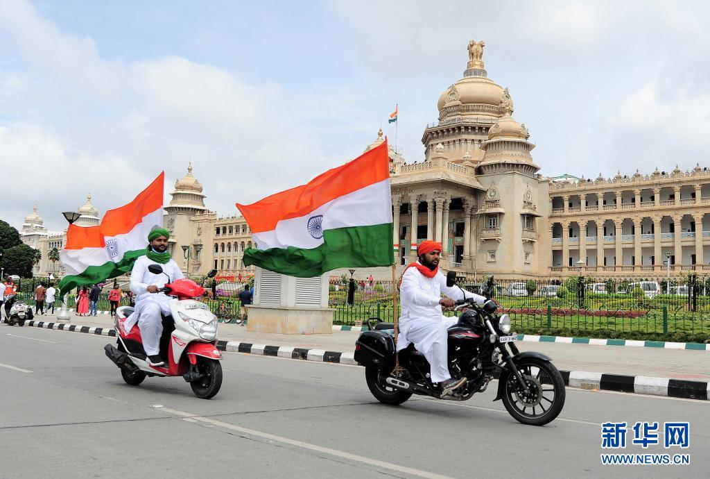8月15日,人們在印度班加羅爾展示印度國旗,慶祝獨(dú)立日。