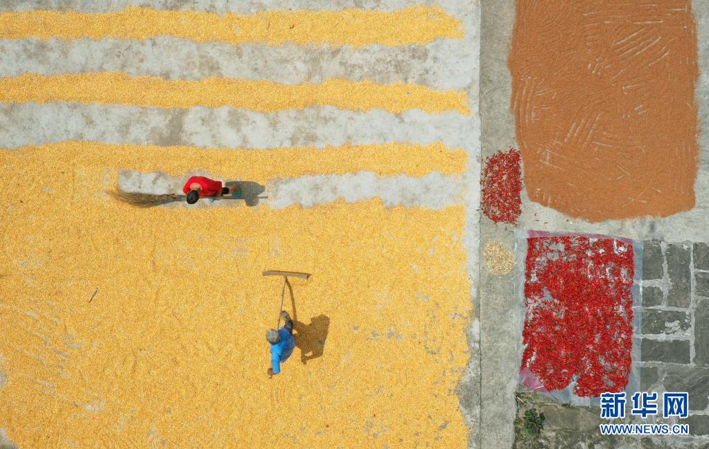 8月17日,赤水市華陽(yáng)村的村民在晾曬玉米(無人機(jī)照片)。