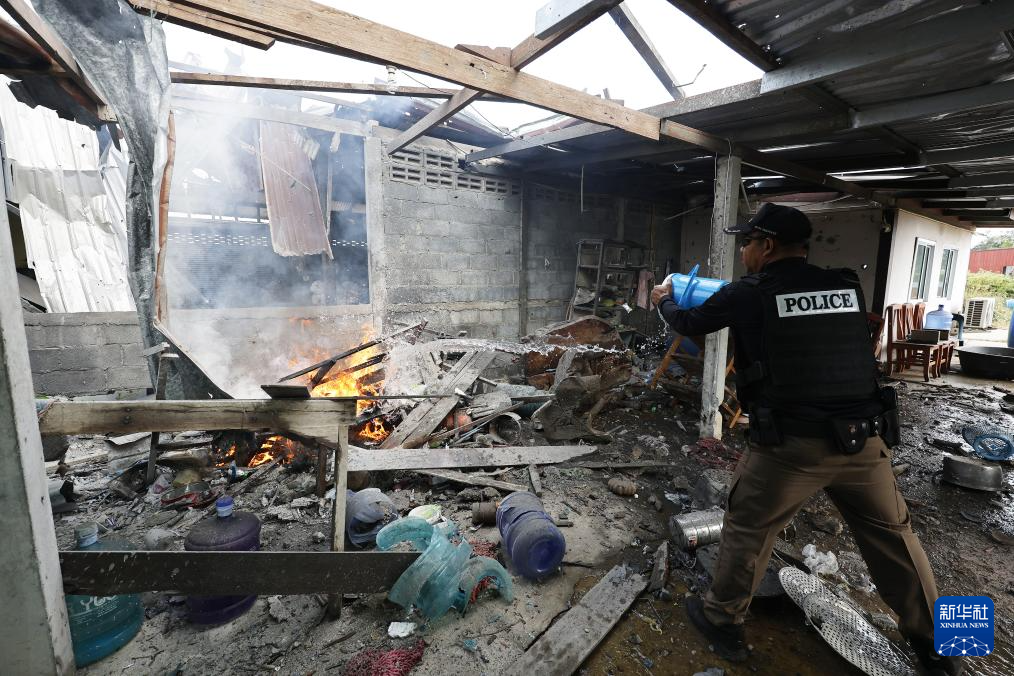 12月11日,在泰国素林府,警察向被炮火损毁的房屋洒水灭火。