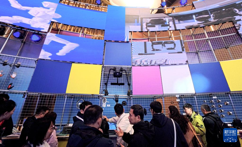 12月12日,工作人员(后)与机器人配合进行悬空搭积木演示。