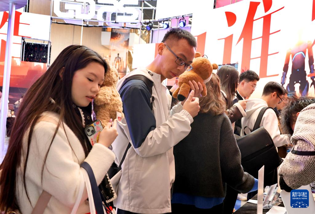 12月12日,参观者在AI智能陪伴机器人展位前体验产品互动功能。
