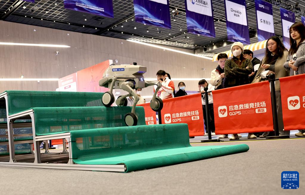 12月12日,轮式机器人在应急救援竞技场演示快速爬楼梯技能。