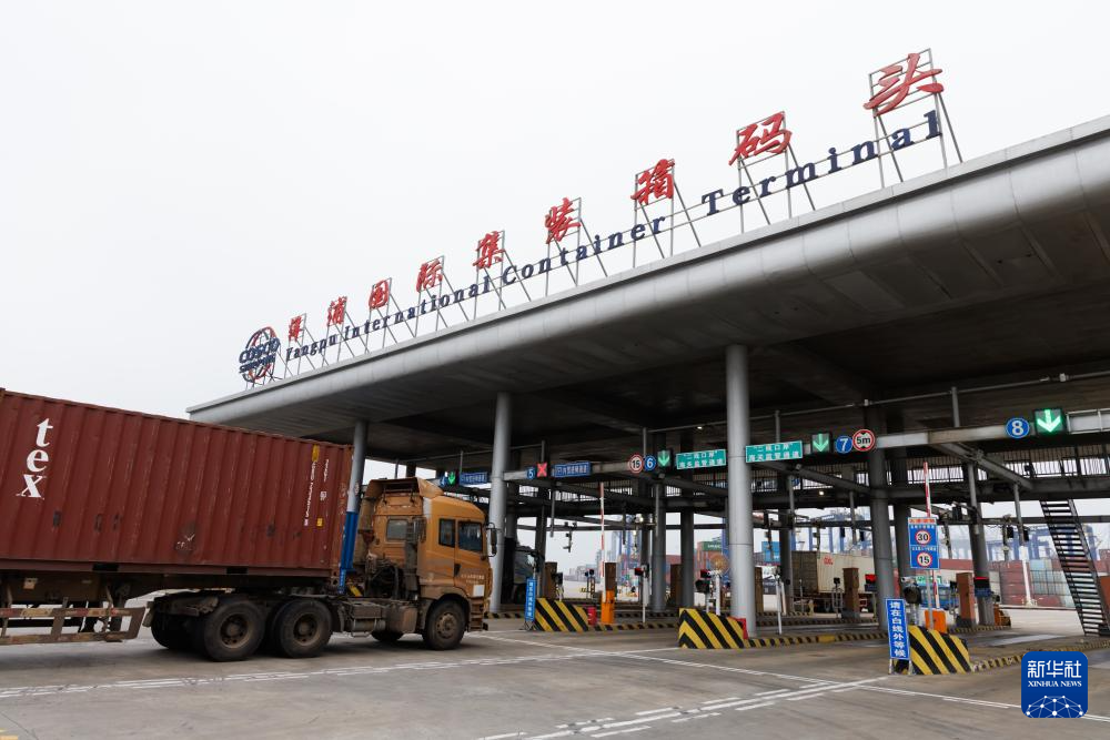 12月11日,在位于儋州市的洋浦国际集装箱码头,货车在进行“二线口岸”压力测试演练。