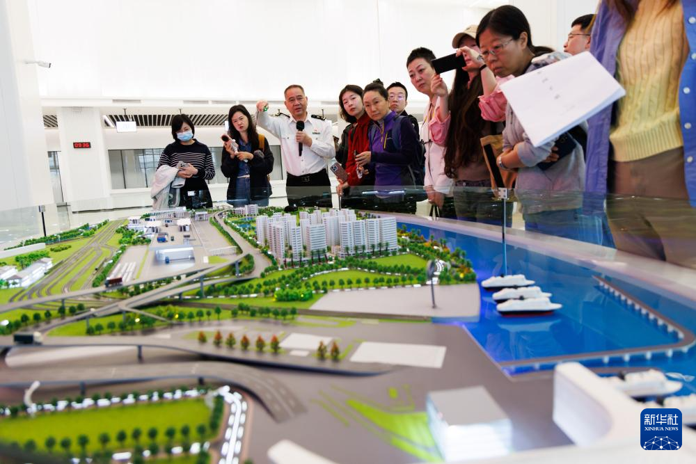 12月10日,在新海港和南港“二线口岸”(货运)集中查验场,海口海关所属海口港海关关长翁裕忠(左三)在讲解查验流程。