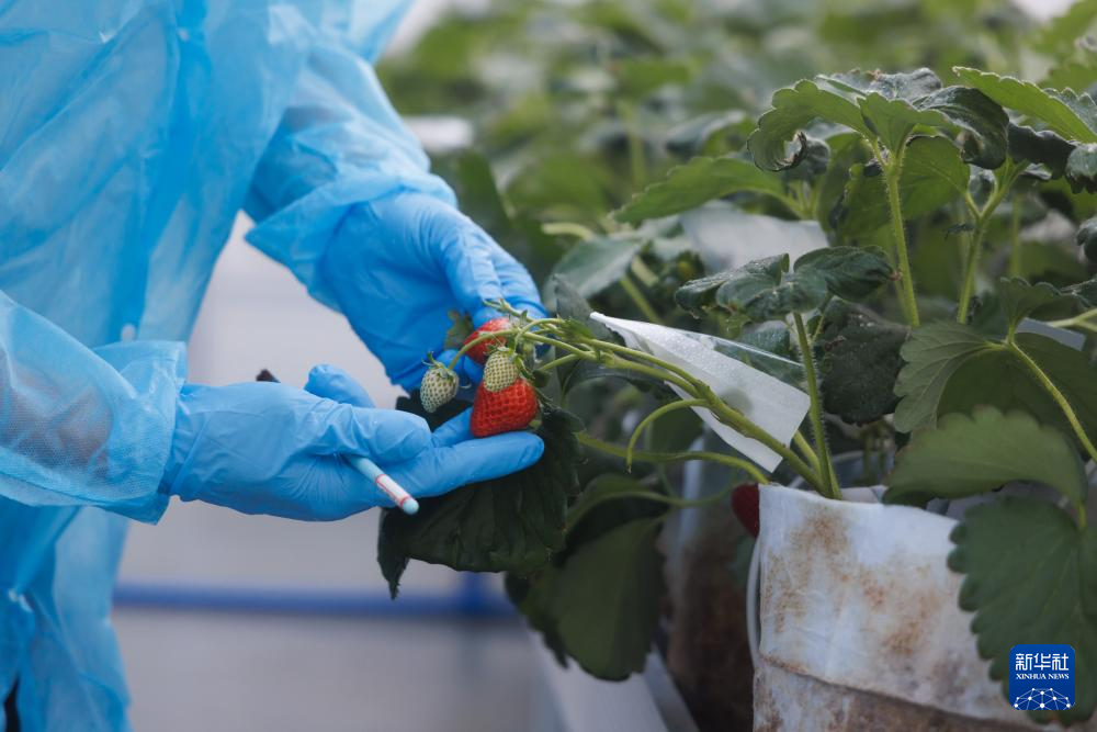 12月11日,在位于海南省三亚崖州湾科技城月亮岛的植物隔离苗圃,海关关员检查进境草莓苗生长情况。