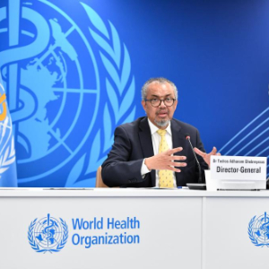 12月11日,世界卫生组织总干事谭德塞在瑞士日内瓦举行的新闻发布会上讲话。