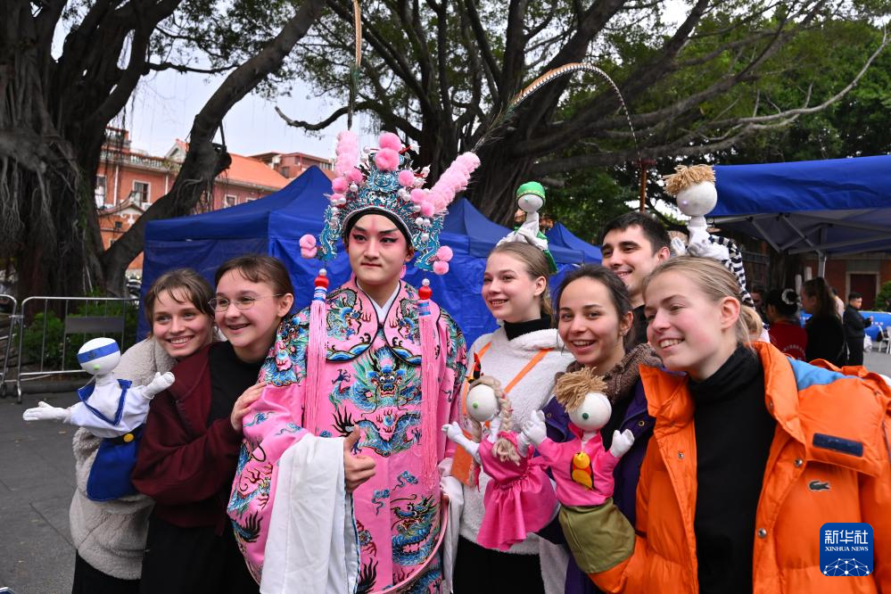 12月12日,参加泉州国际木偶展演活动的俄罗斯青年与中国表演者合影。