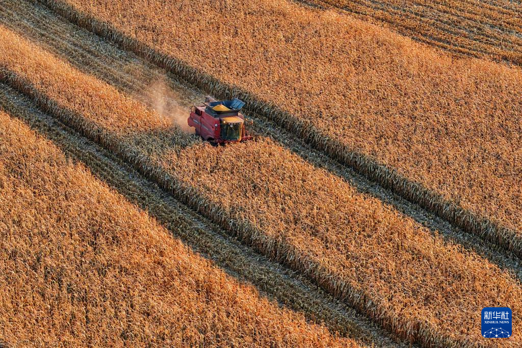 10月14日在黑龙江省同江市街津口赫哲族乡,农户在收获玉米(无人机照片)。