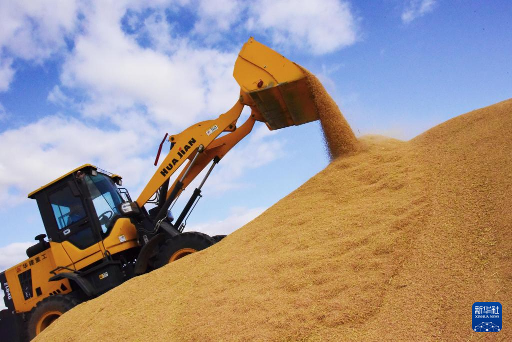 10月8日,在北大荒集团黑龙江绥滨农场有限公司东井管理区粮食晒场,工人操作机车对收获的水稻进行集中堆放。