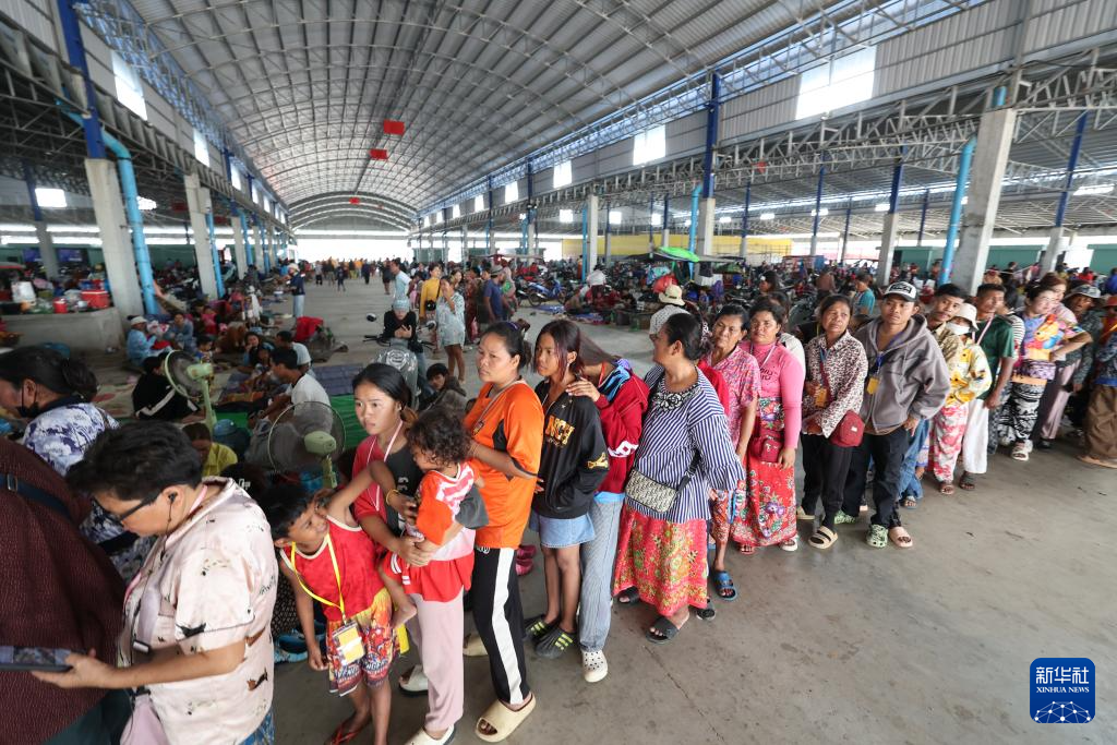 12月12日,在柬埔寨班迭棉吉省的一处居民安置点,因柬泰边境冲突而撤离的柬埔寨民众排队领取物资。