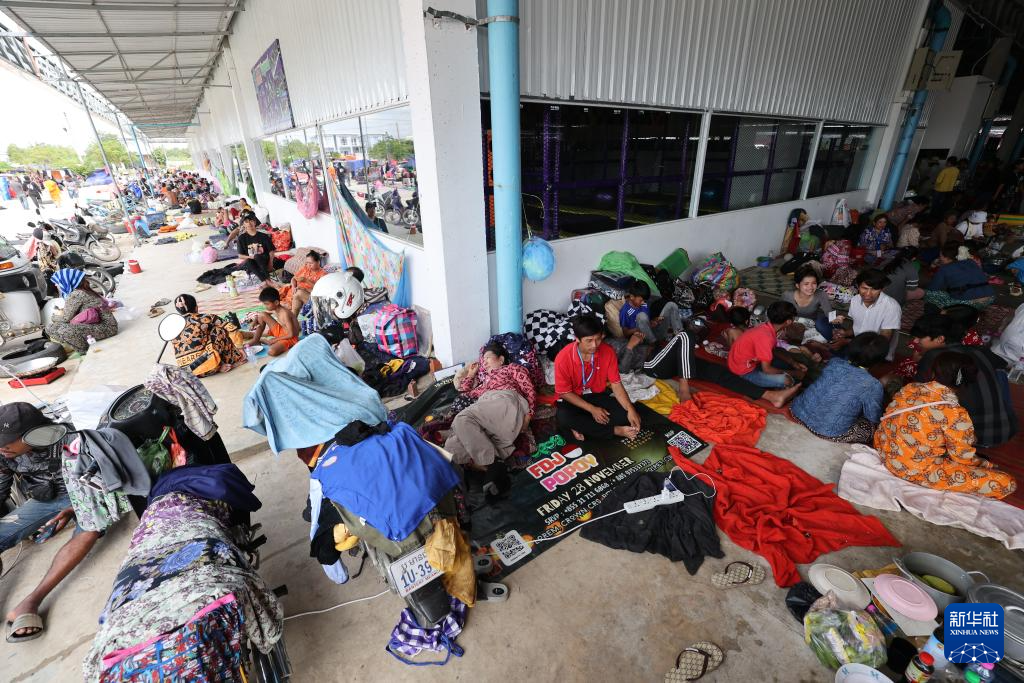 12月12日,在柬埔寨班迭棉吉省的一处居民安置点,因柬泰边境冲突而撤离的柬埔寨民众在休息。