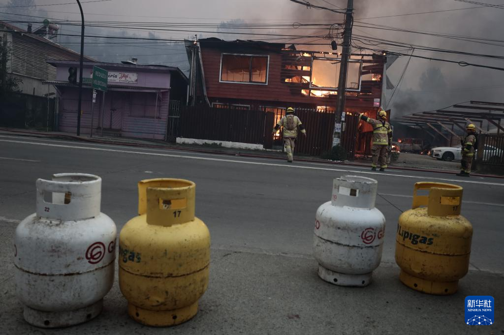 1月18日,消防员在智利比奥比奥大区彭科市救火。