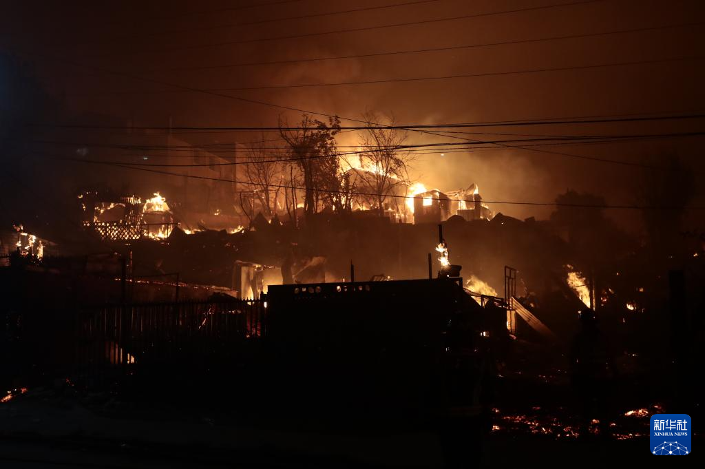1月18日,在智利比奥比奥大区彭科市,一名女子站在燃烧的建筑前。