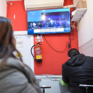 1月19日,人们在西班牙马德里一家餐厅内观看高铁脱轨相关新闻。