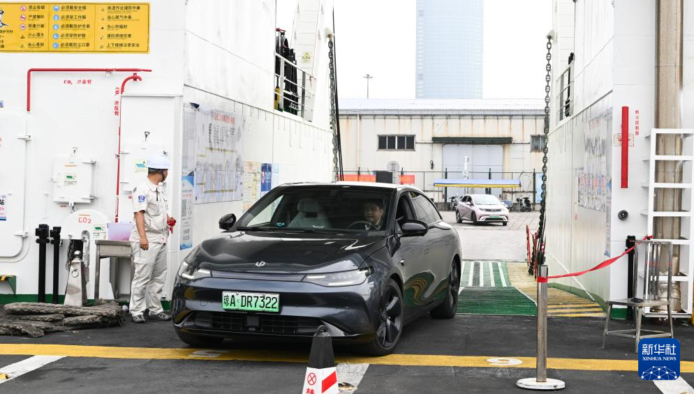 1月30日,在海南省海口市秀英港,工作人员指挥新能源汽车在“绿源二号”上有序停放。