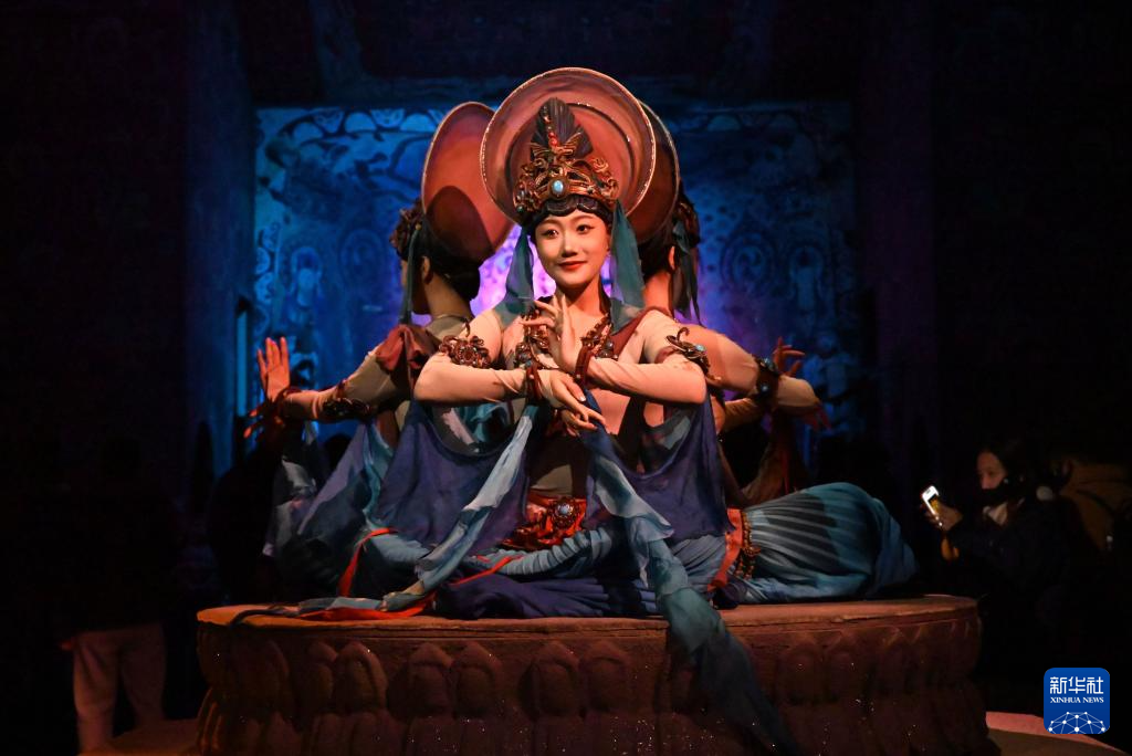 1月9日晚,乐动敦煌(敦煌)文化旅游产业发展有限公司的演员在大型洞窟沉浸式体验剧《乐动敦煌》中表演。