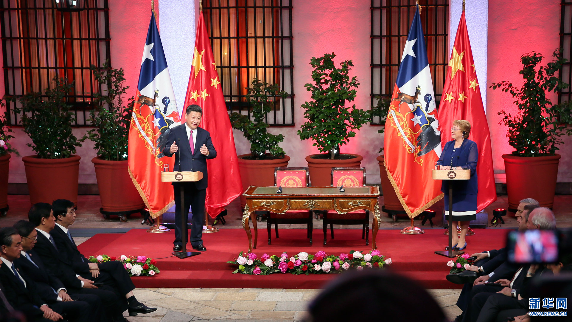 11月22日,國家主席習近平在圣地亞哥同智利總統巴切萊特舉行會談。這是會談后,兩國元首共同會見記者。 新華社記者 蘭紅光 攝2016-11-23