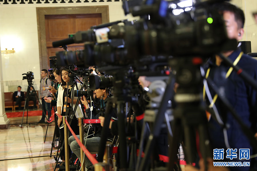 10月19日,“黨代表通道”第二場(chǎng)采訪活動(dòng)在人民大會(huì)堂舉行。圖為現(xiàn)場(chǎng)媒體記者準(zhǔn)備采訪。新華網(wǎng) 翟子赫 攝